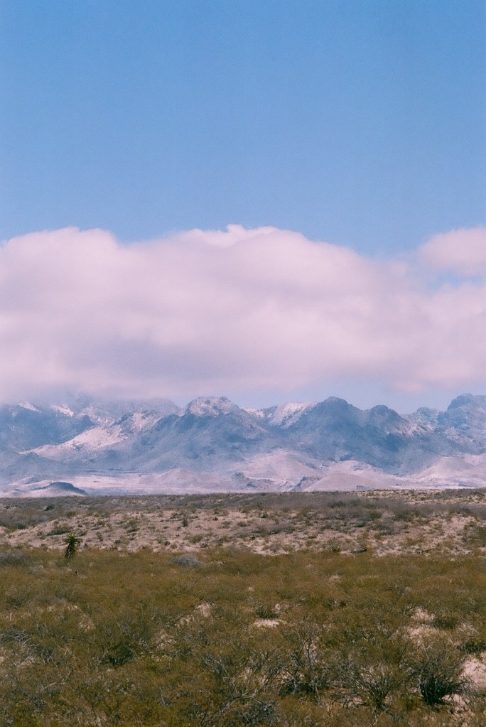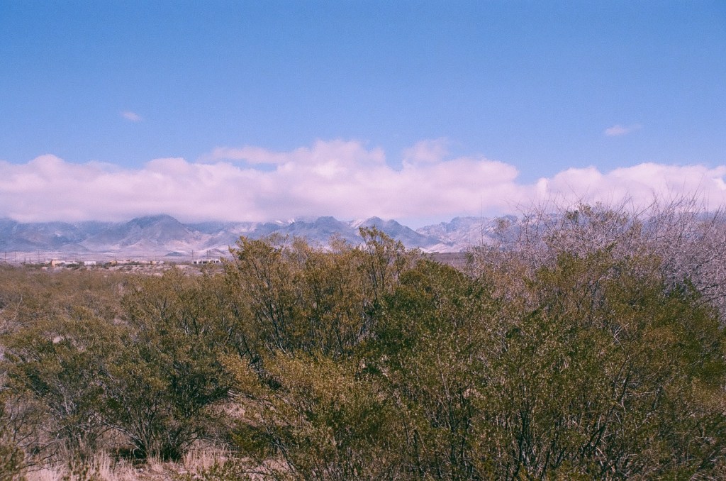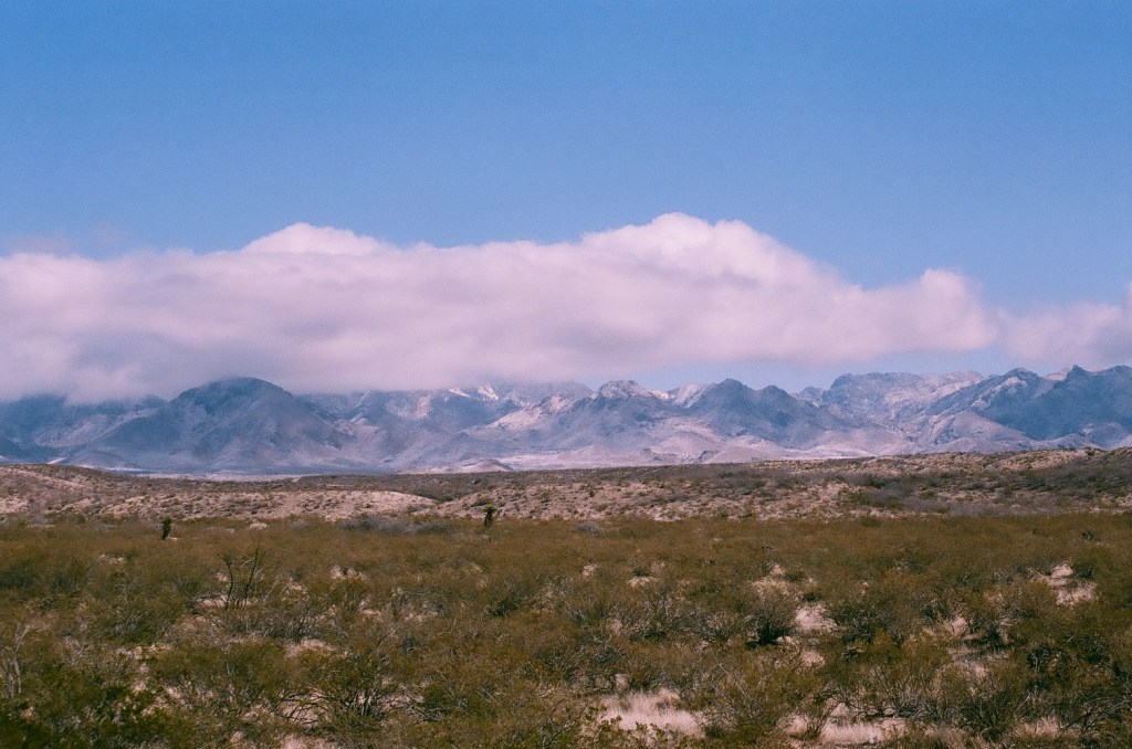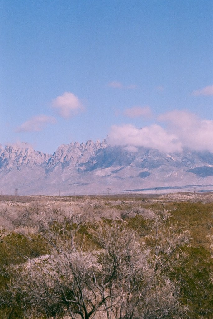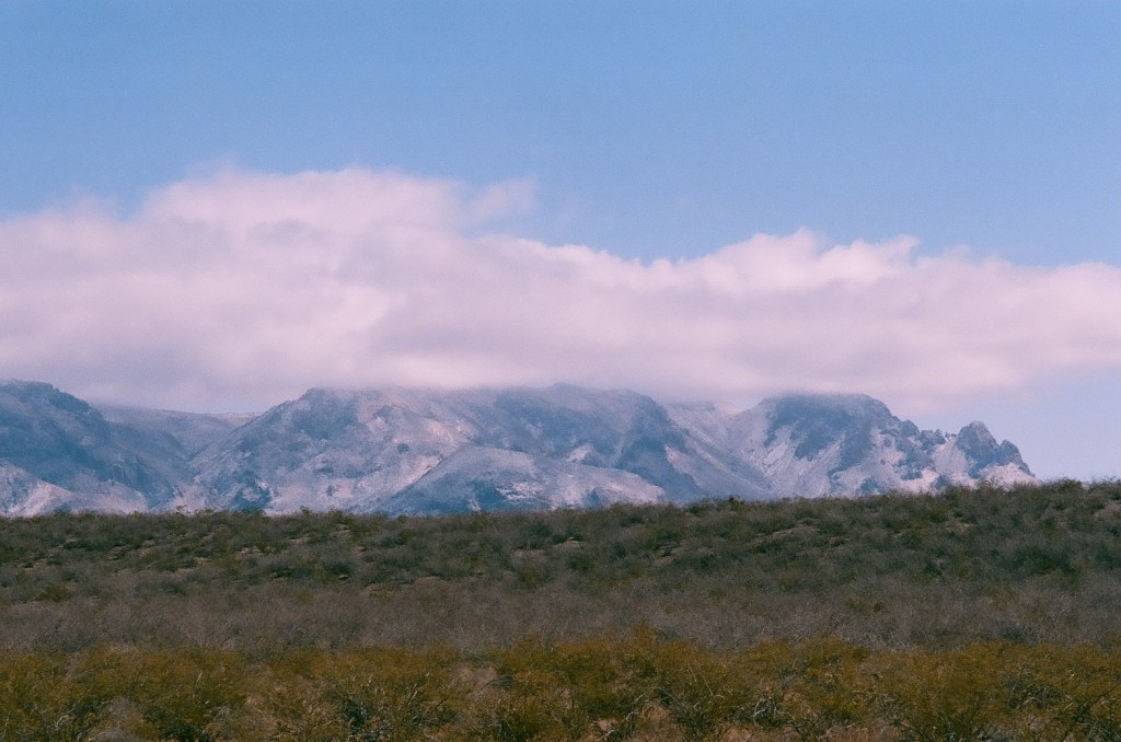 I motored over to a spot of ground stewarded by the Bureau of Land Management and parked at the toe of an enormous geological pimple. Little sounds stirred. It was mostly quiet but for some dude in his car nearby. Admittedly, he was quiet, too, and perhaps wanting to be alone with his thoughts. Quien sabe? Figuring so, I walked about in search of right and honorable vantage points to snap a picture or two of the mountains. All about me stood clusters of the great indicator plant known as creosote, sometimes called greasewood, and a true denizen of the Chihuahuan frontier. I aimed the camera’s lens toward the mountains to include the desert floor and its hardy squatter dotting the landscape, and with the snow in the crevices and on the peaks surmounted by a blanket of clouds, I suspected at least a few of the views would be captured on film sufficient to show someone without discrediting the beautiful views. I’ll trust others to judge for themselves whether memorable scenes were recorded or not.