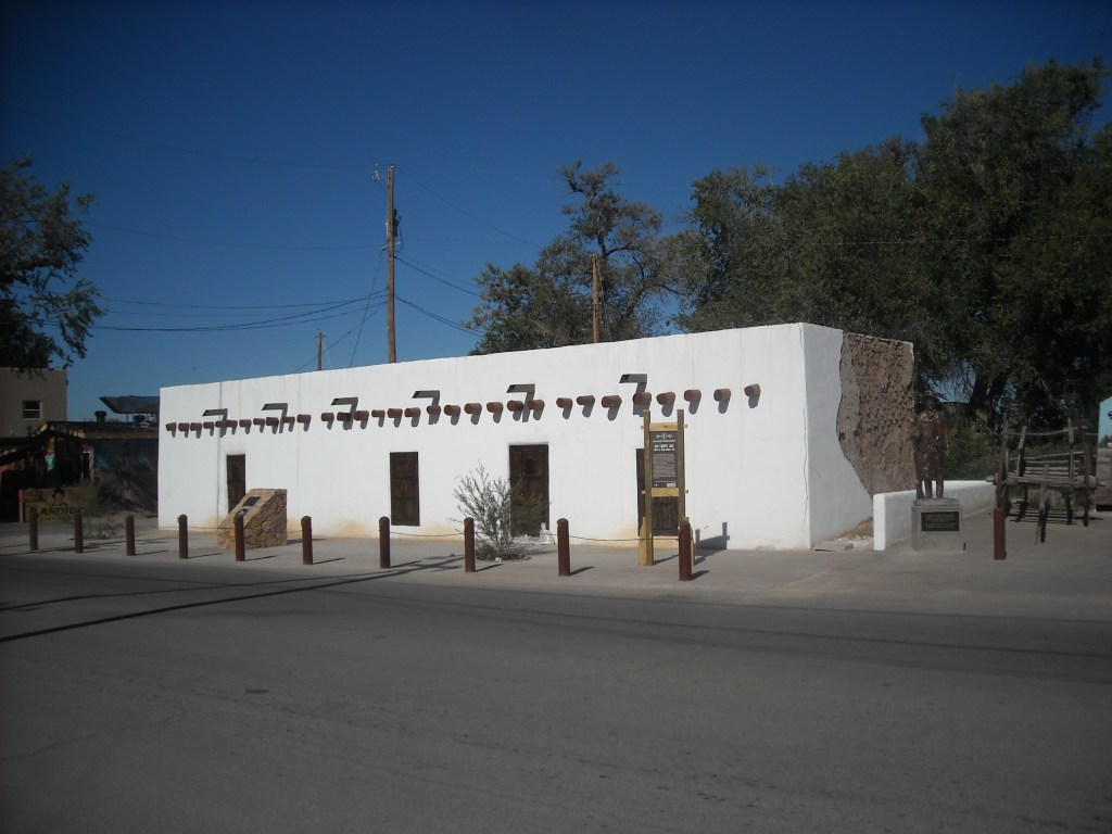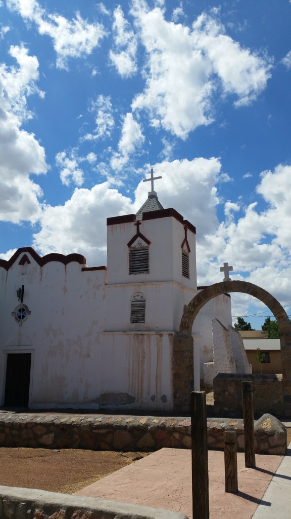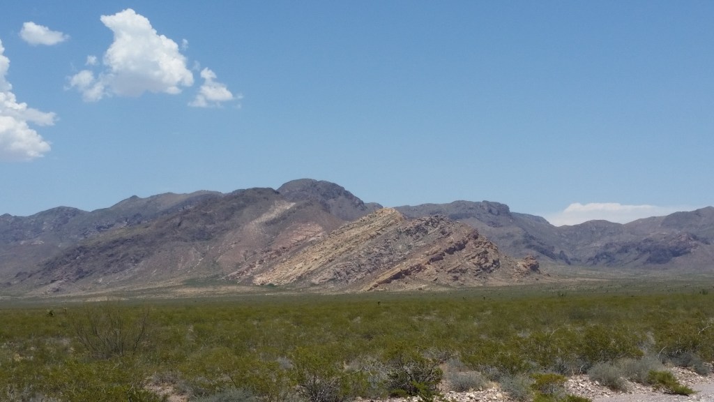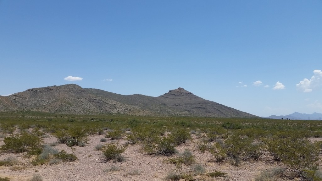 Summer in the Chihuahuan Desert seldom isn’t hotter’n a two dollar pistol, a climate unsuited and uncomfortable for many, which is one of the reasons I have embraced it so well. Out on the range, though, we endured a momentary blue northern; I’ll be damned but if an arctic blast didn’t creep in for a snap and plummet the temperature to a chilly 103º F. To add to our difficulties, as we were driving in and later when we were heading out, with the windows down of course, a bunch of cousins to the common house fly swarmed us. I don’t know if the salt on our forearms from the perspiration drew them or whether they represented some sort of welcoming vanguard to the southern end of the Organ Mountains can only be conjectured, but there we were, looking at the Earth’s shape-shifting from a time before human reckoning. From where we stood by the side of the road, to our right on a southerly angle, rose the peak that upon observation does resemble a liturgical mitre, while to the north a geological blemish wrought by faulting and folding some many, many years ago exposes a three hundred foot tall outcropping known as Peña Blanca. As a sidebar, suffice it to say that the east side of that squat formation features a few caves, and in them archaeologists have found corncobs and bones that dated to the Mogollon culture epoch, which indicates that humans have lived in this territory for many thousands of years.